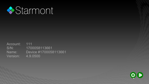 Power on the device, and when it boots to the start screen (as shown to the left), click on the "Settings" icon (gear icon) on the lower right hand side of the display. After doing this, it will take a couple of seconds for the first configuration dialog to appear.