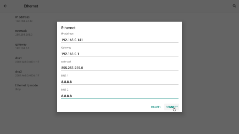 Enter the IP information you received from your IT department in each of the fields. IP address, Gateway and both DNS server addresses all need to be complete and exact in order to work. You can scroll down the page using the scroll wheel on your mouse. When done, click "CONNECT".